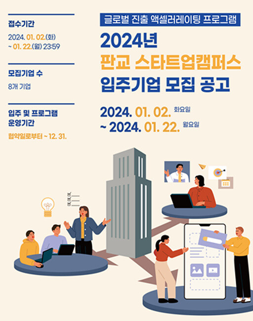 '판교 스타트업 생태계 활성화를 위한 글로벌 액셀러레이팅 지원'으로 추진되는 이 프로그램은 경기도경제과학진흥원(GBSA)이 주관하고 와이앤아처가 운영하며, 모집기업 수는 8개 기업이며, 사업 기간은 12월 31일까지이다.