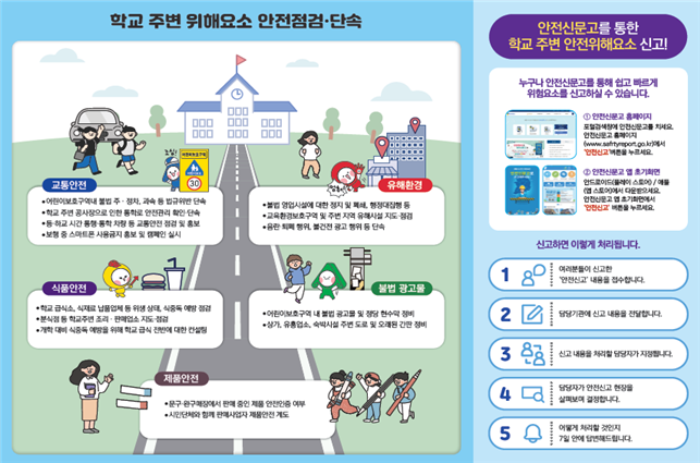 박명균 예방정책국장은 “정부는 관계기관과 함께 초등학교 주변에서 안전을 위협하는 요소를 찾아 선제적으로 정비하고, 국민 여러분께서도 우리 아이들이 안심하고 생활할 수 있도록 학교 주변 위해요소 점검에 많은 관심과 참여를 부탁드린다”라고 당부했다.