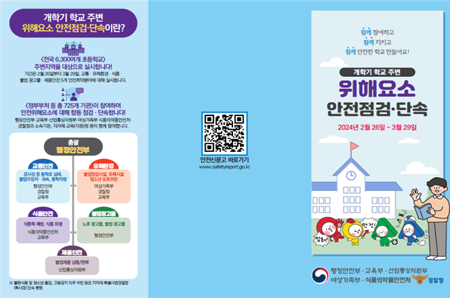 매년 1·2학기 개학 시기에 안전점검을 실시하고 있으며, 올해는 전국 6,300여 개 초등학교를 대상으로 ▲교통안전, ▲유해환경, ▲식품안전, ▲제품안전, ▲불법광고물 5개 분야를 집중적으로 점검할 예정이다.
