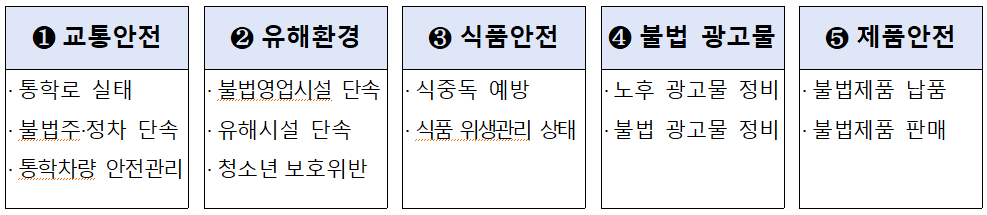 교통안전·유해환경·식품안전·제품안전·불법광고물 5개 분야