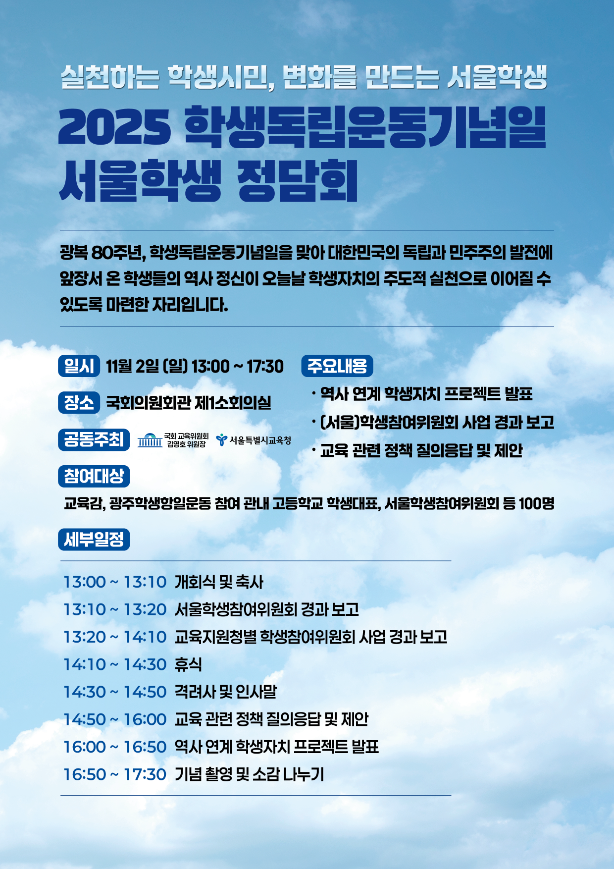 [피앤피뉴스=마성배 기자] 서울특별시교육청이 국회 교육위원회와 함께 ‘2025 학생독립운동기념일 서울학생 정담회’를 오는 11월 2일 오후 1시 국회의원회관에서 연다.
