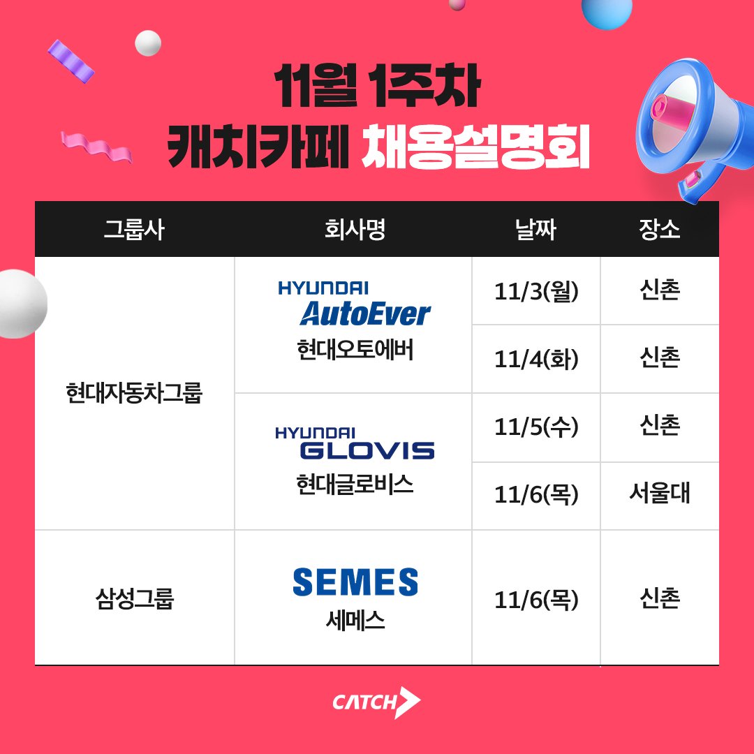 ‘캐치카페’는 신촌·안암·혜화·서울대 인근 4개 지점에서 운영 중인 무료 취업 라운지다. 이곳에서 진행되는 채용설명회는 단순 홍보가 아니라 직무 중심 면담이 핵심이다. 소규모 상담과 질의응답을 중심으로, 지원자는 직무 적합성을 현장에서 확인할 수 있다.