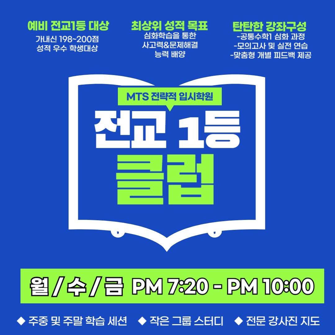 엠티에스학원 관계자는 “15년 가까이 성남 지역 고교 대입에만 집중하며 풍생고, 복정고를 비롯 성남 지역 고등학교 내신에 완벽하게 대비할 수 있는 자료와 수업 및 시스템을 갖췄다”며 “엠티에스 전교 1등 클럽은 상위권 학생들의 현재 상태를 점검하고 겨울방학동안 완벽하게 성취도를 높일 수 있는 프로그램을 통해 개인 맞춤 수업으로 최상의 만족을 끌어내는 것이 목표”라고 말했다.