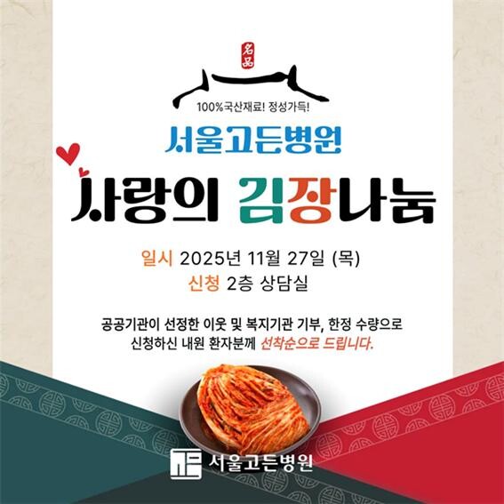 서울고든병원이 본격적인 겨울을 앞두고 지역사회에 따뜻한 온기를 전하기 위해 오는 11월 27일 ‘2025 사랑의 김장나눔’ 행사를 진행한다. 이번 나눔은 병원의 핵심 가치인 소통, 행복, 성장을 실천하는 대표적인 사회공헌 활동으로, 직원들이 직접 정성껏 김장을 담가 취약계층과 내원 환자들에게 전달하는 의미 있는 시간으로 꾸며질 예정이라고 전했다.