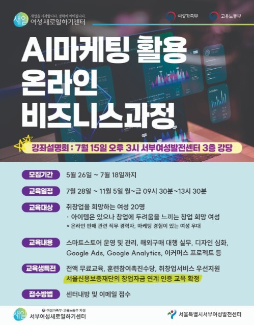 서울시서부여성발전센터(서부새일센터)가 여성가족부 지원으로 진행되는 ‘AI마케팅 활용 온라인 비즈니스 과정’의 교육생을 오는 7월 18일까지 모집한다. 이번 교육은 온라인 유통 분야에서 창업을 희망하는 여성을 대상으로, 실제 창업이 가능하도록 구성된 실전형 교육 과정이다.