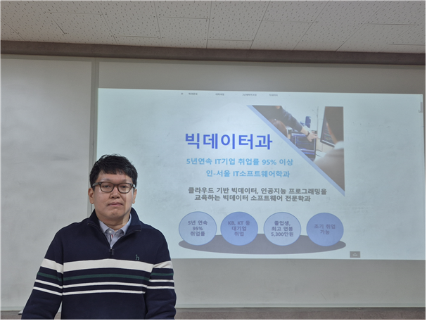 <인서울 대학 한국폴리텍대학 서울강서캠퍼스 빅데이터과 소개를 이협건 학과장이 하고 있다.>