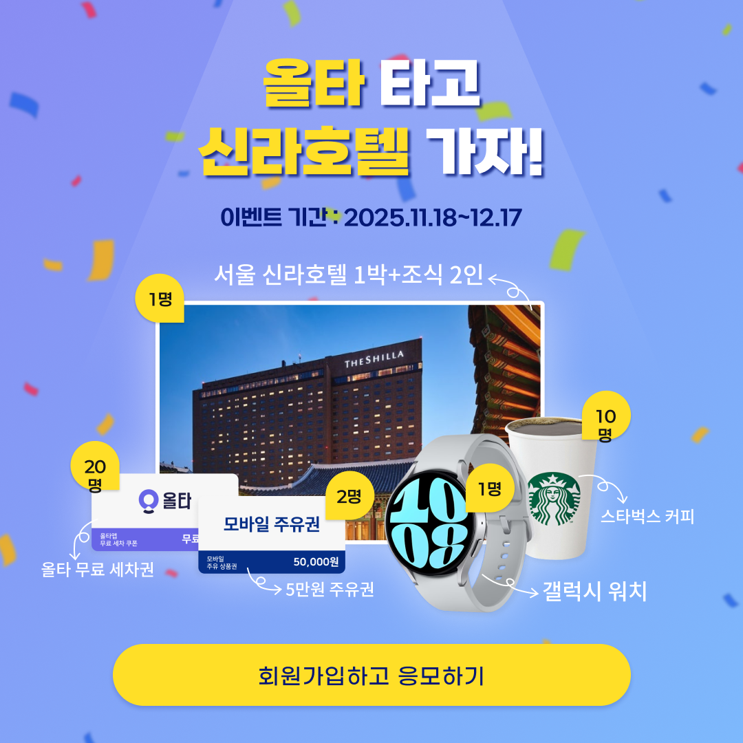 첫 번째 이벤트 '올타 타고~ 신라 호텔 가자!!'는 추첨을 통해 특급 호텔 숙박권을 비롯한 다양한 경품을 제공한다. 1등 당첨자에게는 서울신라호텔 1박 숙박권과 조식 2인 이용권이 제공되며, 2등에는 갤럭시 워치, 3등에는 5만원 상당 주유쿠폰(2명), 4등 무료세차권(10명), 5등 스타벅스 아메리카노 쿠폰(20명) 등 총 34명에게 경품이 돌아간다. 이번 이벤트는 올타 회원이면 누구나 자동으로해당 이벤트에 자동참여 되며, 추첨을 통해 행운의 당첨자를 선정한다.