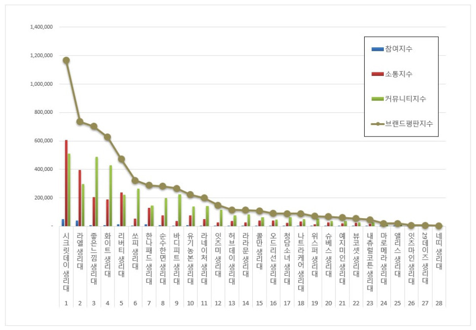 브랜드에 대한 평판은 브랜드에 대한 소비자들의 활동 빅데이터를 참여가치, 소통가치, 소셜가치, 시장가치, 재무가치로 나누게 된다. 생리대 브랜드 브랜드평판지수는 참여지수, 소통지수, 커뮤니티지수로 분석했다.