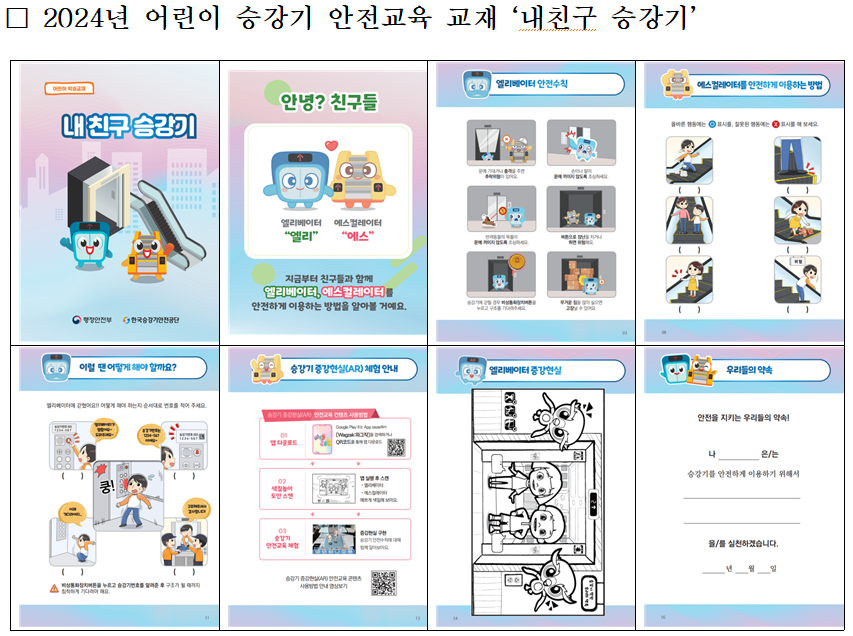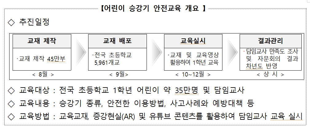 이번 교육에서는 초등학교 1학년의 눈높이에 맞춘 교재와 영상이 활용된다. 교재는 초등학교 교사들의 의견을 반영해 승강기 이용 방법, 사고 사례, 예방 대책 등을 담아 총 45만 부를 제작했으며, 9월에 전국 5,961개 초등학교에 배포됐다.