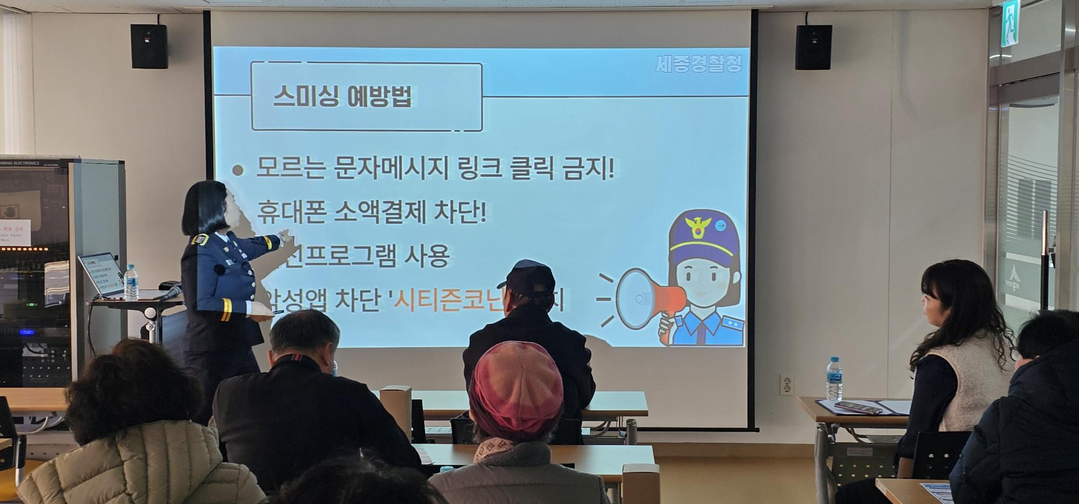 지난 2월 20일, 세종시 종촌복합커뮤니티센터 2층 노인문화센터에서 열린 이번 교육에는 세종 경찰청 사이버수사대 이보람 경사가 강사로 나서 최신 피싱 수법과 예방법에 대해 상세히 설명했다. 특히, 최근 급증하는 스미싱과 보이스피싱 사례를 중심으로 실제 피해 사례와 대응 방법을 소개하여 큰 호응을 얻었다.
