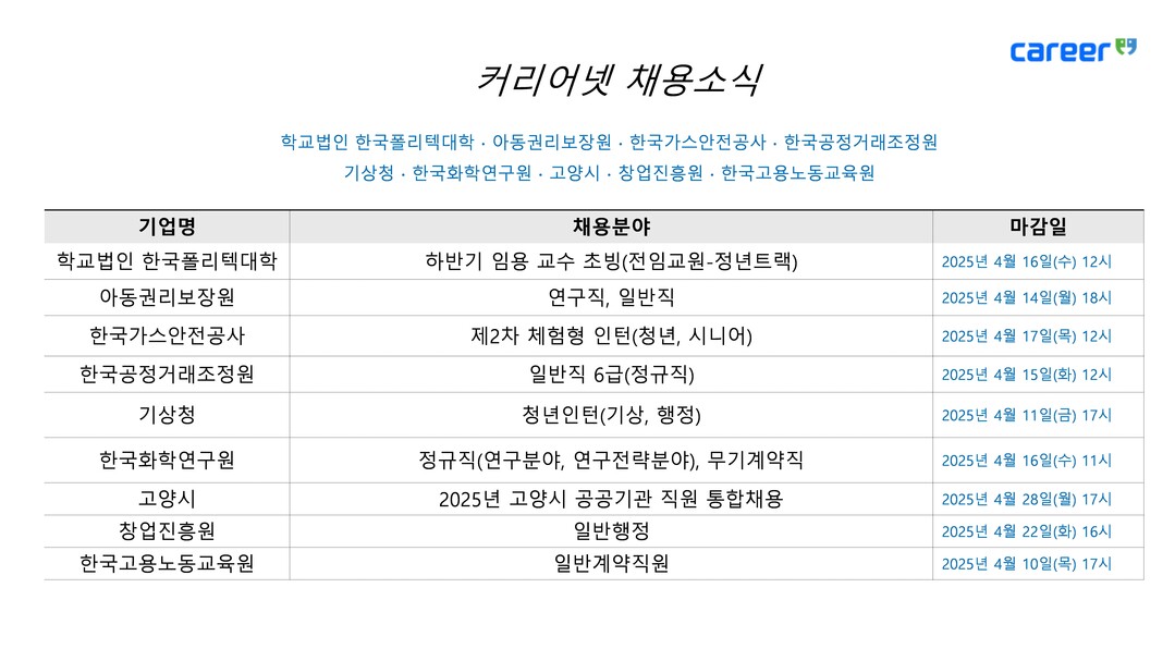 학교법인 한국폴리텍대학, 아동권리보장원, 한국가스안전공사, 한국공정거래조정원, 기상청, 한국화학연구원, 고양시, 창업진흥원, 한국고용노동교육원 등 9개 기관이 분야별 신규 인재 모집에 나서며, 구직자들의 눈길을 끌고 있다.