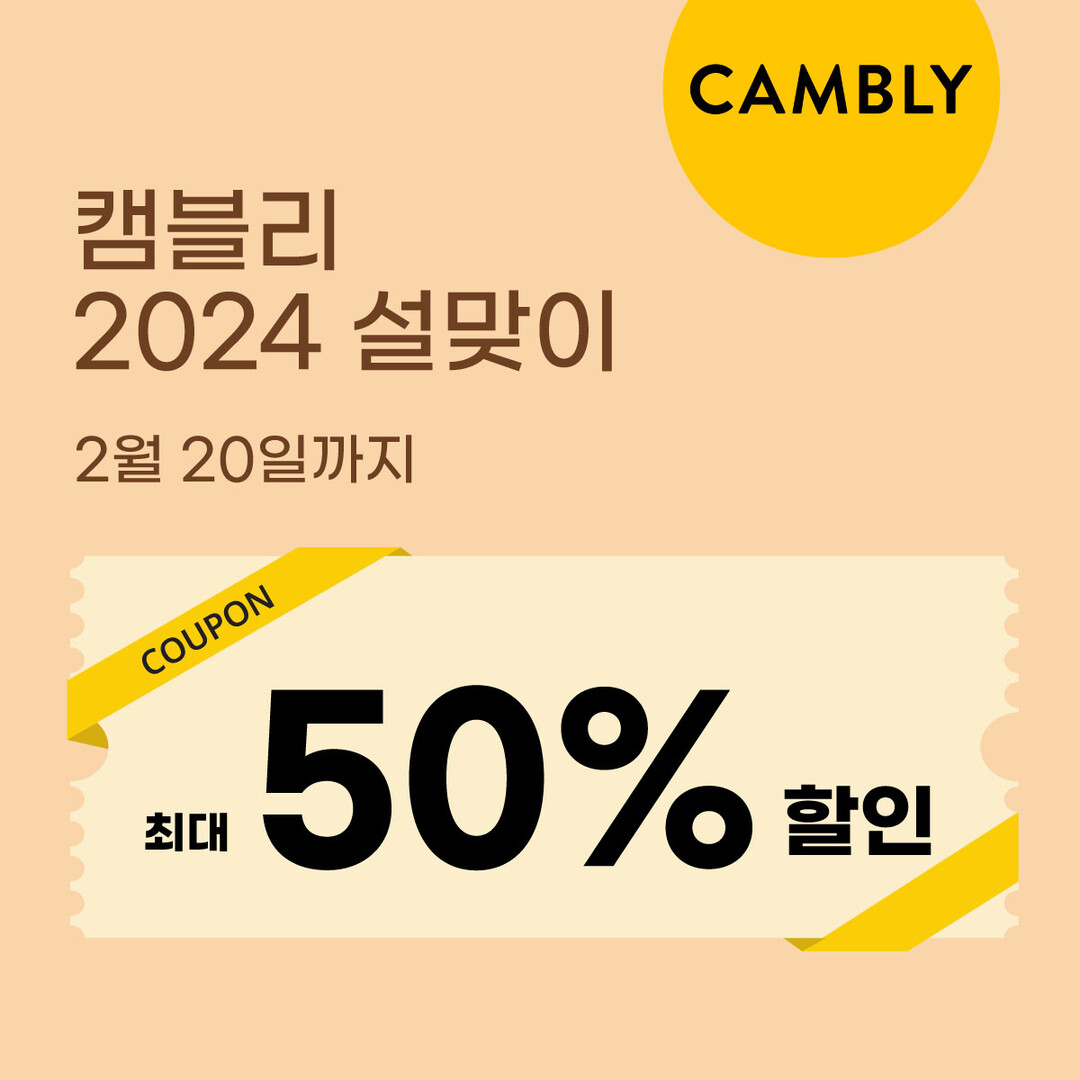 이에 원어민 화상영어 캠블리(CAMBLY)가 최대 50% 할인을 받을 수 있는 ‘24설날할인’ 특별 프로모션을 진행한다.