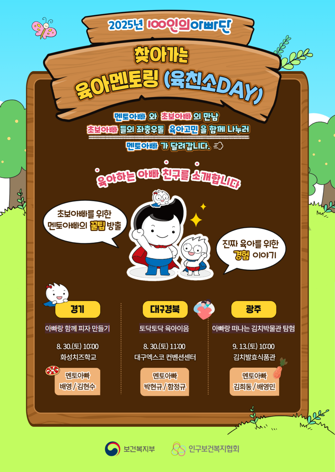 [피앤피뉴스=마성배 기자] 보건복지부(장관 정은경)와 인구보건복지협회(회장 이삼식)는 전국 ‘100인의 아빠단’을 대상으로 한 ‘찾아가는 육아 멘토링(육친소DAY)’ 행사를 전국 3개 지역에서 개최한다고 밝혔다. 이번 프로그램은 지난달 30일 경기와 대구에서 먼저 열렸으며, 오는 9월 13일 광주에서 마지막 일정이 진행된다.