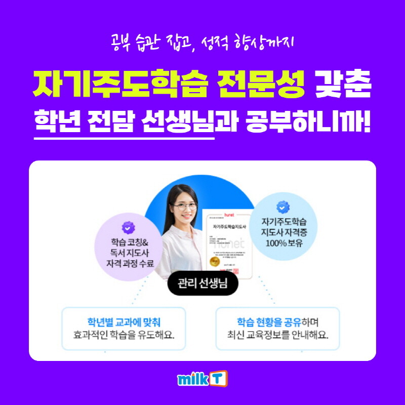 특히 밀크T초등의 관리 선생님은 ‘자기주도학습 지도사’ 자격증을 100% 수료한 교육 전문가들로 구성되어 있어 학생의 성향과 수준에 맞는 학습 계획을 제시하고, 학년과 적합한 과목별 공부법을 알려준다.
