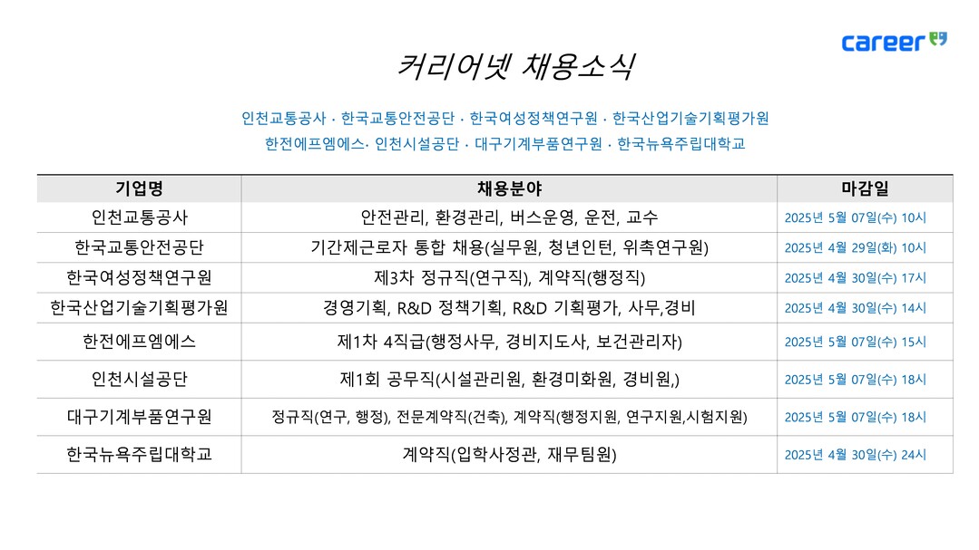 취업 포털 커리어는 24일 인천교통공사, 한국교통안전공단, 한국여성정책연구원, 한국산업기술기획평가원, 한전에프엠에스, 인천시설공단, 대구기계부품연구원, 한국뉴욕주립대학교 등 8개 기관이 신규 채용에 들어갔다고 밝혔다.
