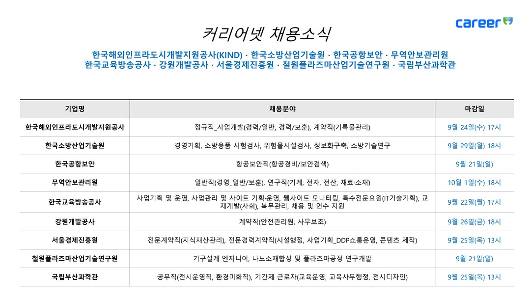 취업 포털 커리어는 16일 한국해외인프라도시개발지원공사, 한국소방산업기술원, 한국공항보안, 무역안보관리원, 한국교육방송공사(EBS), 강원개발공사, 서울경제진흥원, 철원플라즈마산업기술연구원, 국립부산과학관 등 9개 기관이 신규 채용을 진행한다고 발표했다.