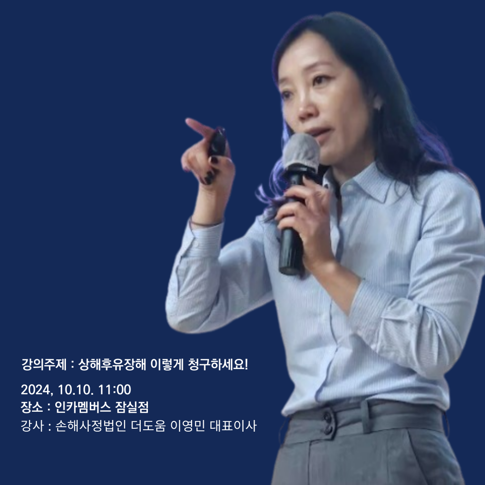 손해사정법인 더도움 이영민 대표이사가 지난 10일부터 인카멤버스 잠실점에서 진행한 ‘상해후유장해 이렇게 청구하세요!’ 주제의 강의를 성료했다고 14일 전했다.