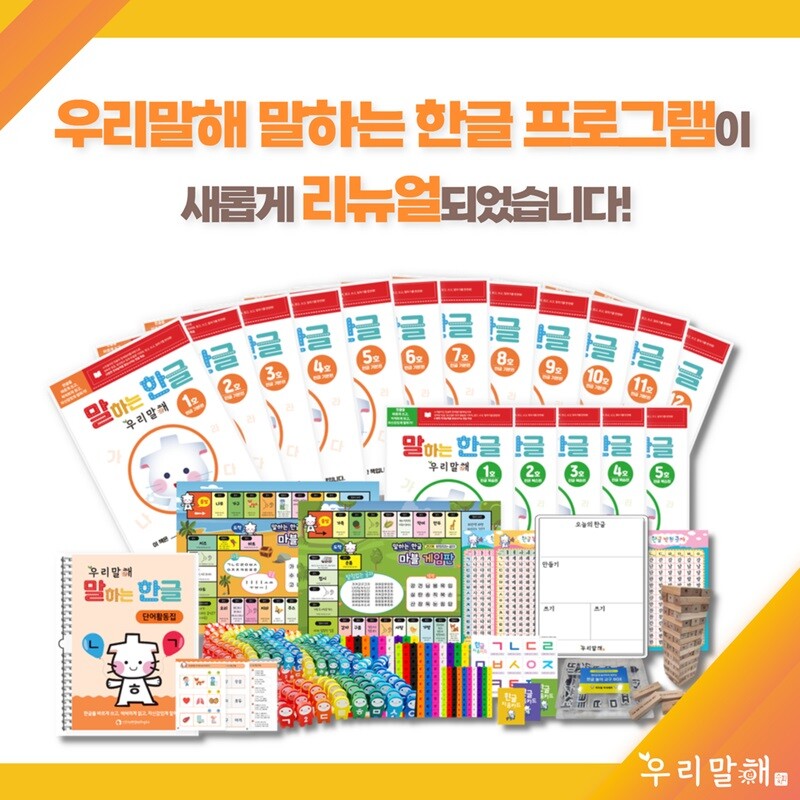 이번에 리뉴얼 출시된 한글 프로그램은 만 3~5세의 유아에게 흥미와 재미 등의 긍정적 자극을 줄 수 있는 교구가 추가되었으며, 음가법 학습으로 빠르고 완벽하게 한글을 뗄 수 있으며, 듣기/읽기/쓰기/말하기 영역별 활동으로 유아의 언어 능력 향상에 초점을 맞췄다.