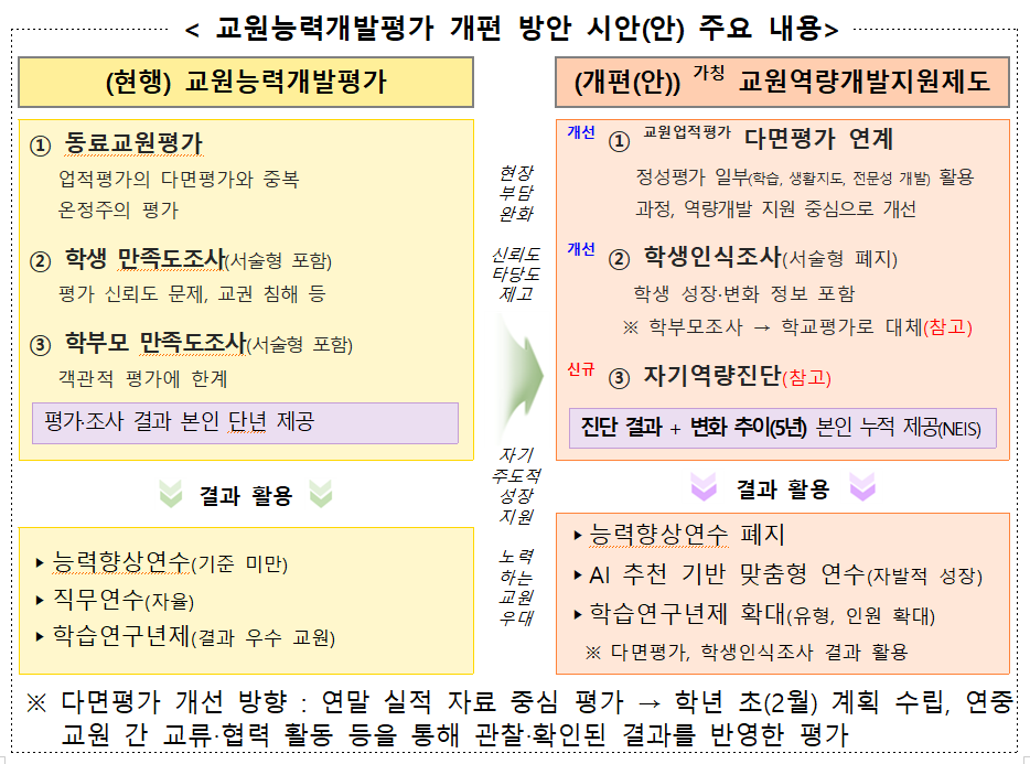개편 방안의 핵심은 기존 교원능력개발평가를 폐지하고, 교원의 역량 개발을 실질적으로 지원할 수 있는 ‘(가칭) 교원역량개발지원제도’로 재설계하는 것이다. 이 제도는 동료교원에 의한 진단, 학생인식조사, 자기역량 진단 결과를 활용해 교원의 교육활동을 개선하고, 인공지능(AI) 기반 맞춤형 연수 추천 및 보상(인센티브) 확대 등을 포함하고 있다.