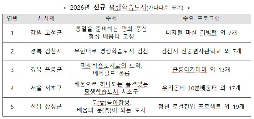 신규 평생학습도시로는 강원 고성군, 경북 김천시, 경북 울릉군, 서초구, 전남 장성군이 선정됐다. 서초구는 생활권 10분 배움터와 명사 특강, 아버지센터 운영 등을 포함한 지역형 프로그램을 제시했다. 장성군은 청년 로컬창업과 여성 취·창업 교육을 함께 편성했다.