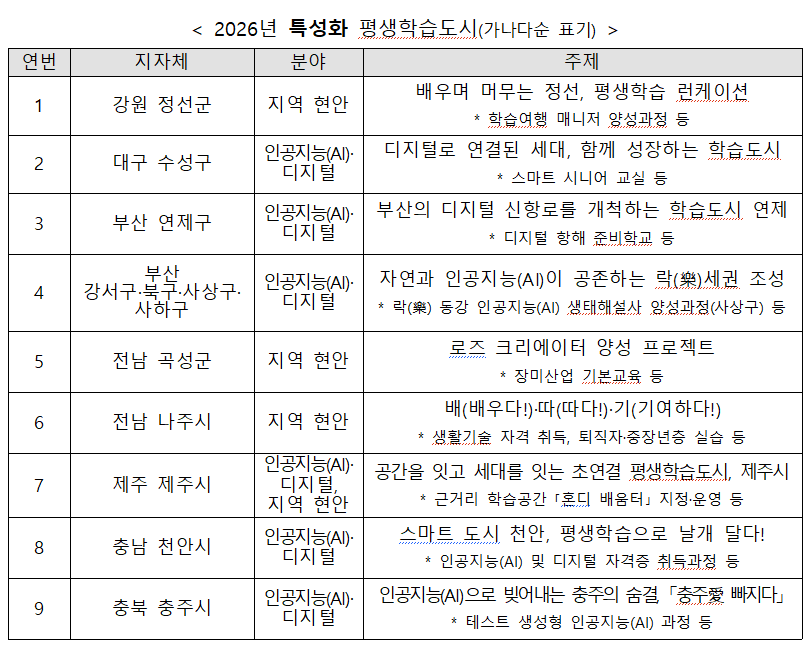교육부와 국가평생교육진흥원은 2026년 평생학습도시 선정 결과를 발표하고 기존 지정 도시 가운데 9곳을 특성화 평생학습도시로 다시 선정했다. 인공지능 전환, 고령화, 지역 산업 변화처럼 지역별 현안에 맞춘 프로그램 운영이 중심이다.