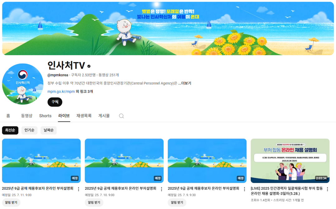 설명회는 ‘인사처tv’ 유튜브 채널을 통한 실시간 스트리밍 방식으로 운영되며, 접속 URL은 7월 9일 오전 9시에 채용후보자 등록 시 기재한 휴대전화번호로 개별 문자 발송된다. 본 설명회는 채용후보자만 참여할 수 있으며, 접속 링크의 외부 유출은 금지된다. 실시간 참여가 어려운 경우에는 7월 14일까지 다시보기를 통해 영상을 시청할 수 있다.