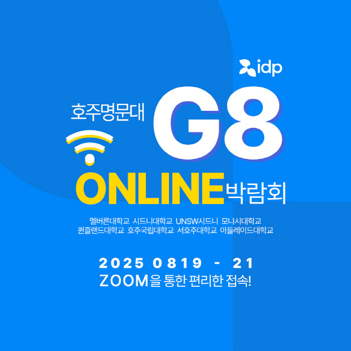 공인영어시험 IELTS 주관사이자, 글로벌 유학기관 IDP 한국지사는 오는 8월 19일부터 21일까지 3일간, 호주 최고의 명문대학교 연합체인 Group of Eight(G8) 소속 주요 대학들과 함께하는 온라인 박람회 G8 Virtual Fair 2025를 개최한다고 밝혔다.