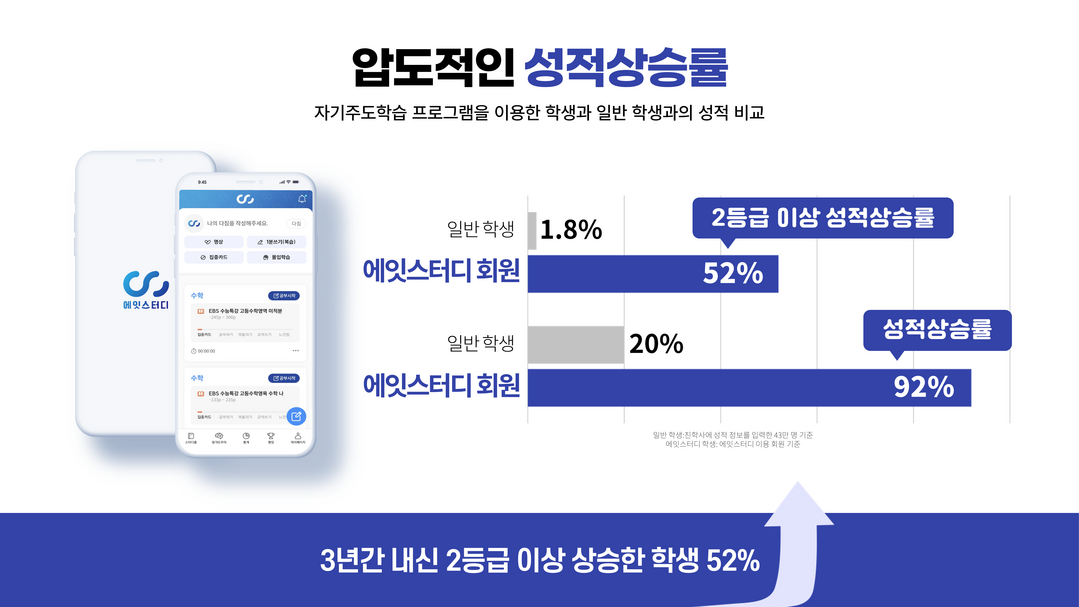 (주)하이커스 측에 따르면 에잇스터디 프로그램을 사용한 학생들의 성적은 평균적으로 92% 향상되었으며, 이는 대한민국의 평균 내신 상승률 25%(진학사 출처)를 크게 상회하는 수치이다.
