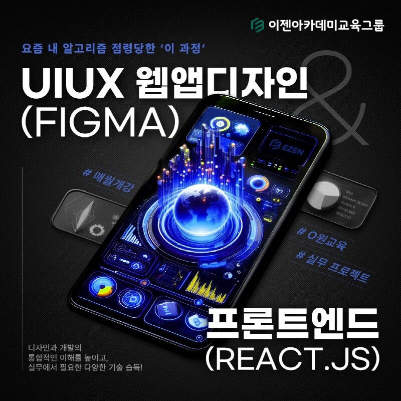 웹개발자학원 이젠아카데미DX교육센터가 오는 27일 국비지원 UIUX 웹디자인&프론트엔드 개발자 취업 과정을 2차 개강한다고 밝혔다.