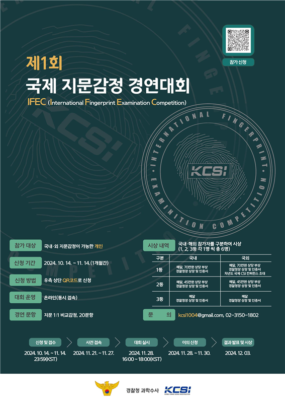 이번 국제 대회를 통해 경찰청은 한국 경찰의 지문 감정 역량을 세계에 알리고, 지문감정관의 전문성을 더욱 강화할 계획이다. 대회는 오는 11월 28일 온라인 동시 접속 방식으로 진행되며, 국내외 참가자 모두 성적에 따라 메달, 부상, 경찰청장 상장 및 인증서를 수여받는다.