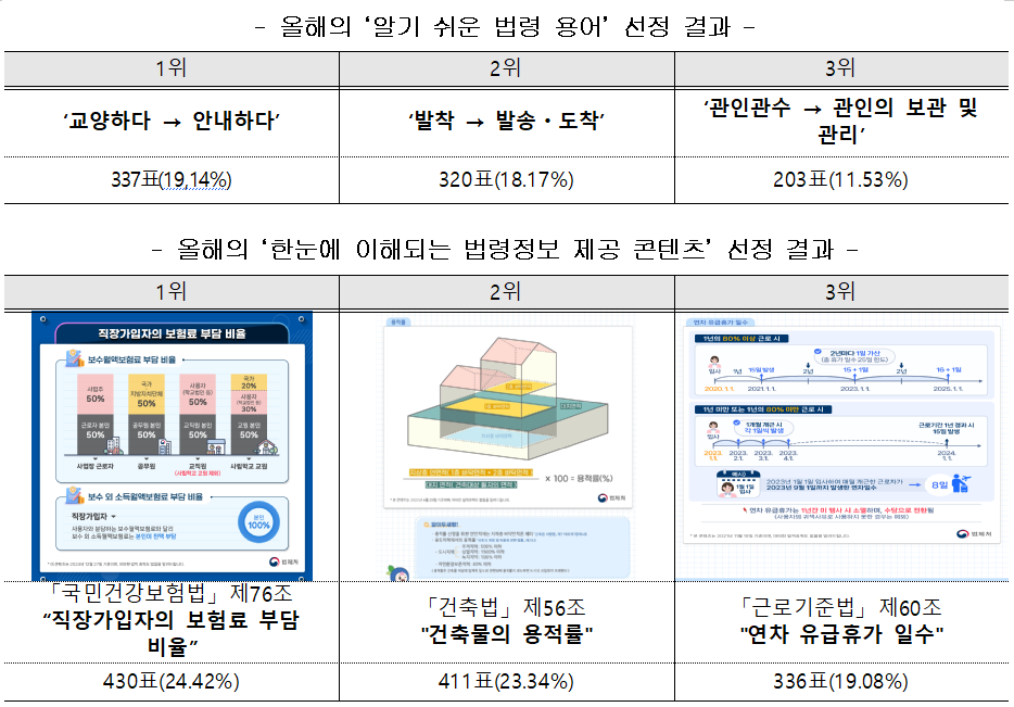가장 많은 표를 얻은 콘텐츠는 「국민건강보험법」 제76조 ‘직장가입자의 보험료 부담 비율’, 2위는 건축물 용적률(건축법), 3위는 연차 유급휴가 일수(근로기준법)가 뒤를 이었다.
