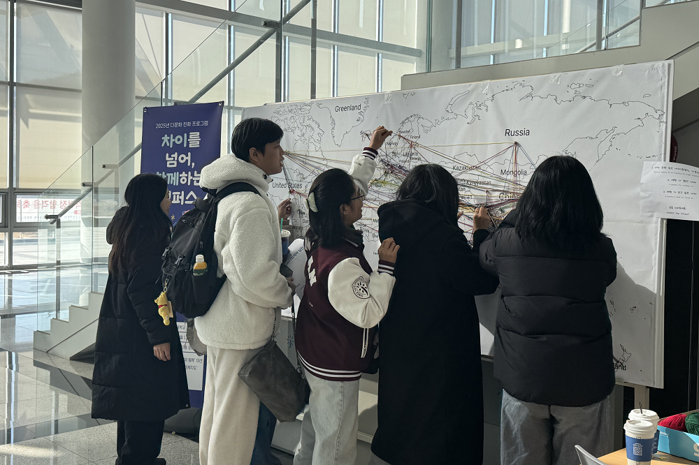 주요 행사로는 ‘우리가 연결되는 세계지도’ 참여형 전시가 진행되었다. 학생들은 자신의 고향 혹은 현재 살고 있는 나라를 표시하고, 앞으로 가보고 싶은 나라까지 실로 연결하며 서로의 문화적 배경을 시각적으로 공유했다. 실로 이어진 세계 지도는 학생들이 가진 다양한 문화적 경험을 한눈에 보여주는 상징적 작품으로, 많은 학생들이 사진을 찍으며 자연스럽게 대화를 나누는 장면이 연출됐다.