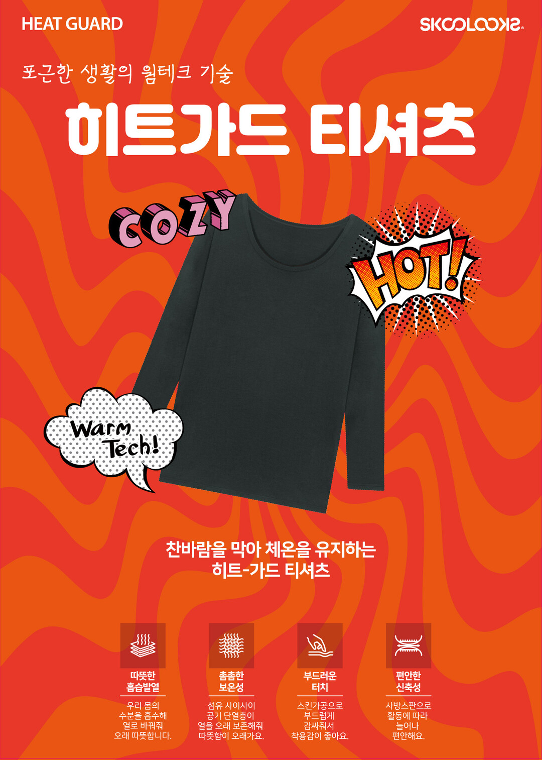 대표 제품인 ‘히트가드 티셔츠’는 태양광 적외선을 흡수해 열을 유지하는 구조를 적용한 기능성 의류다. 섬유 사이 공기층을 활용해 보온 효과를 높였으며, 스킨 가공과 사방 스트레치 소재를 적용해 착용감과 활동성을 함께 고려했다.