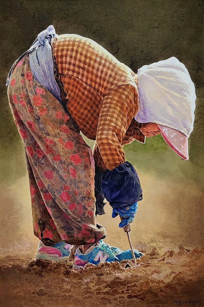 한편 그는 농사짓는 분들을 그렸다. 봄볕 쏟아지기 시작할 무렵 모자에 수건 얹고 골갱이로 밭에 무슨 씨앗인가를 심는 모습의 ‘할망’을 그린 「봄」, 겨울 배추밭에 앉아 따스한 겨울 햇살을 한껏 머금은 ‘아주망’을 그린 「겨울 배추밭」과 같은 작품들은 ‘요망진’(야무진) 제주 여성을 형상화하면서 제주도의 보물이 사람임을 또한 보여준다.