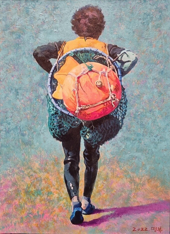 장지에 아크릴로 그린 제주의 여인들은 다채로운 색깔로 구성되어 있다. 달콤한 맛이 담긴 듯한 흙, 장미꽃무늬들이 잘 어우러진 일바지, 푸른빛의 손도매(토시)의 하늘빛 장갑, 하얀 수건을 쓰고 굽은 등허리에 삶의 무게가 보인다. 테왁과 오리발, 소라와 전복, 보말 따위를 가득 담은 망시리를 지고 가는 해녀의 뒷모습은 보랏빛의 그림자를 드리우고 있다. 걸음걸이가 무거울 듯싶지만 그 아름다운 빛깔로 인해 환하고 경쾌하다. 제주의 할망, 어멍을 바라보는 이명복 화가의 시선은 어디에 견주기 어려운 빛깔을 보여준다.