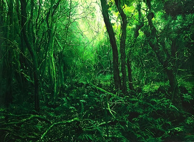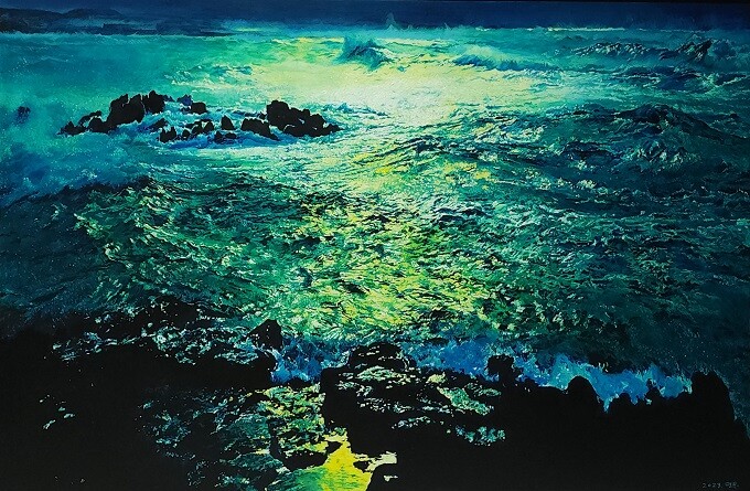 처음에 그는 제주에서 곶자왈과 해녀와 농사짓는 분들의 얼굴을 그렸다. 그의 작업실 근처에 있는 곶자왈이 제주에서의 첫 작업이었다고 했다. ‘곶자왈’은 숲을 뜻하는 ‘곶’과 과 ‘가시덤불’이나 ‘잔 나무와 가시덤불이 있는 숲’을 뜻하는 말인 ‘자왈’을 합성하여 만든 단어다. 최근 사전(『개정증보 제주어사전』(제주특별자치도, 2009))에는 ‘나무와 덩굴 따위가 마구 엉클어져 수풀같이 어수선하게 된 곳’으로 설명된다.(‘곶자왈’이란 말이 처음으로 등장하는 공식 기록은 『제주어사전』(제주특별자치도, 1995)이다.(최수정·현화자(2018), 「곶자왈 용어 정의를 위한 고찰」, 『문학과 환경』 17권 1호, 문학과환경학회, p. 89.)) 그가 사는 저지리 근처 곶자왈에는 비가 오면 물을 머금는 화산암 때문에 숲길이 촉촉하고 울창한 숲, 푸른 이끼 등으로 뒤엉켜 살아 꿈틀대는 곳이다. 화가는 서늘한 초록으로 빛을 내는 곶자왈을 「4월의 숲」, 「곶자왈」과 같은 작품으로 묘사하고 있다. 푸른 색조 중심의 곶자왈 묘사는 원시성을 갖하게 드러내면서 제주 자연의 신성함까지 자아낸다. 또한 일출과 일몰 또는 풍랑이 일 듯한 순간을 포착하고 있는 바다를 드러낸 「엄마의 바다」와 「절정」 같은 작품들 또한 제주의 신성(神性)을 자아내고 있는 듯하다.