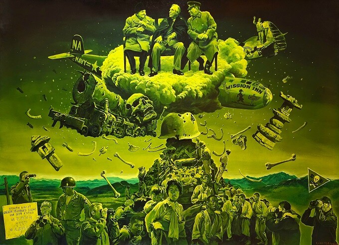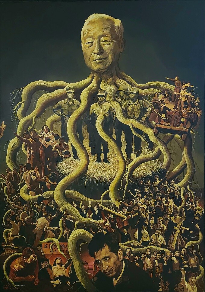 「뿌리」는 김수영의 시 「거대한 뿌리」를 통해 착안한 작품이다. 김수영 선생 탄생 100주년 전에 맞춰 2021년에 현대사를 그려놓은 것이다. 시의 마지막 구절에는 “괴기영화의 맘모스를 연상시키는 / 까치도 까마귀도 응접을 못하는 시커먼 가지를 가진 / 나도 감히 상상을 못하는 거대한 거대한 뿌리에 비하면”이라 했다. 시인은 아무리 더러운 전통이라도, 더러운 역사라도 시커먼 가지를 가진 ‘거대한 뿌리’에 비한다면 좋다고 말한다. 화가는 수많은 민중을 죽음으로 몰아넣으면서 권력을 유지하려 한 독재자들의 역사가 어떻게 뻗어나갔는지를 하나의 화폭 속에 그려넣었다. 이승만을 정점으로 하여 박정희, 전두환으로 이어지는 독재 정권의 흐름으로 이어지는 뿌리로 표현하고, 그 틈바구니에서 민주화를 부르짖었던 민중의 모습을 그려내고, 하단 중앙에 고뇌하는 김수영을 그려 넣었다. 김수영의 표현처럼 “괴기영화의 맘모스를 연상시키는” 그림이다. 이처럼 현대사의 부정적 대상을 그릴 때면 기괴해진다. 야만성과 비합리성, 미성숙성 따위와 연결되는 기괴(奇怪)의 세계와 연결된다. 머리만 덩그러니 있고 그 목을 따라 수많은 뿌리가 뻗쳐나가는 기괴한 형상은 한국 현대사의 부정적 세력의 계보를 보여주면서, 쿠르베가 말하는 역사화의 지향점에 가 닿는다.
