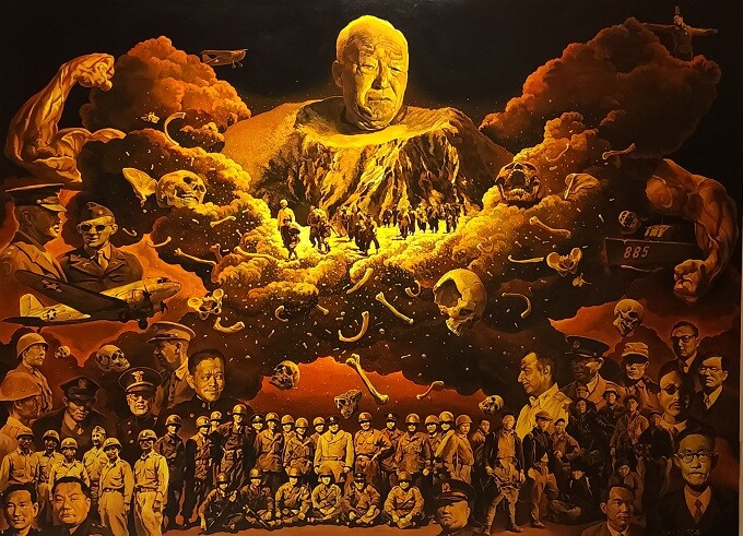 “지금까지 남겨진 사진과 최대한 근사치로 그려내려고 노력했어요. 그 이유가 뭐냐 하면 이건 기록적인 측면을 많이 갖고 있다고 저는 생각을 해요. 언제까지 이렇게 남아 있을지 모르지만 이런 인물들이 제주도민을 어떻게 했다는 것에 대한 강조를 한 거예요. 그래서 이제 저기 지금 보면 그때 당시에 제주도의 연대장들 그다음에 이제 여기 지금 오른쪽 하단에는 저 사람 같은 경우는 한경직 목사예요. 한기총. 이제 사람들은 다 의문을 가지겠죠. 아니 한경직 목사가 왜 거기에 있나 얘기를 하는 거죠. 한라산 꼭대기에는 이승만을 그리고요.”