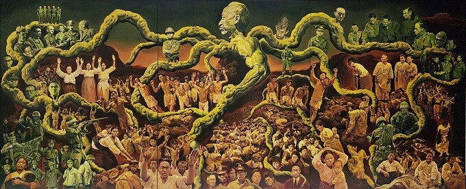 이명복 화가는 역사화에서 뒤틀린 근현대사를 진실하게 드러내야 한다는 소명 의식 같은 것을 느낀다. 독재 정권하에서 시름시름 앓으면서도 제 목소리를 내지 못했던 제주 4.3의 피해자들을 전면에 등장시키고, 기괴한 형상들 속에 가해자들의 계보를 진실하게 알리려는 그의 노력은 놀라울 정도다. 언젠가는 그 진실이 대중에게 가 닿을 날이 올 것이다. 이명복 화가는 한국 근현대 역사화의 새로운 지평을 열어 보이고 있는 중이다.