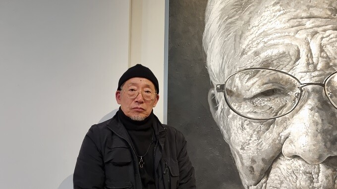 “시작은 저렇게 안 했어요. 해녀와 농사짓는 분들 얼굴을 크게 그렸어요. 여성 노인들은 말씀은 안 하시지만 4.3을 다 겪으신 분들이죠. 가슴 속에 다 응어리가 들어 있지만 얘기를 못하셨던 분들이죠. 그분들 초상을 그리고 하다가 그분이 살아온 얘기를 짧게나마 쭉 듣고 그러다가 이야기를 가장 극적으로 할 수 있는 표정을 찾아내죠. 2019년도에 이분(김평국)을 인터뷰했어요. 코로나 때문에 준비만 하다가 2021년도에 이제 옮겨놓은 거죠.”