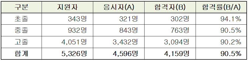 최고령 합격자는 △초졸 설○○(여·80대), △중졸 이○○(남·70대), △고졸 김○○(남·80대)였고, 최연소 합격자는 △초졸 윤현석(남·11세), △중졸 안수현(여·11세), △고졸 박효주(여·12세)로 확인됐다.