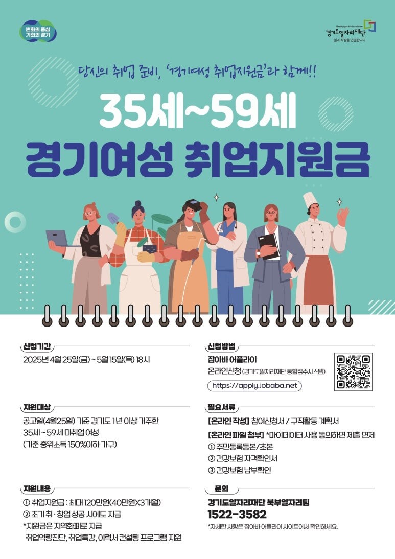 지원 대상은 △경기도에 1년 이상 거주한 △35세~59세의 미취업 여성 중 △가구 소득이 중위소득 150% 이하이며 △적극적으로 구직 의사가 있는 경우다. 정량평가(소득구간, 미취업 기간, 거주 기간)와 정성평가(구직활동계획서)를 종합해 고득점자 순으로 최종 선발된다.