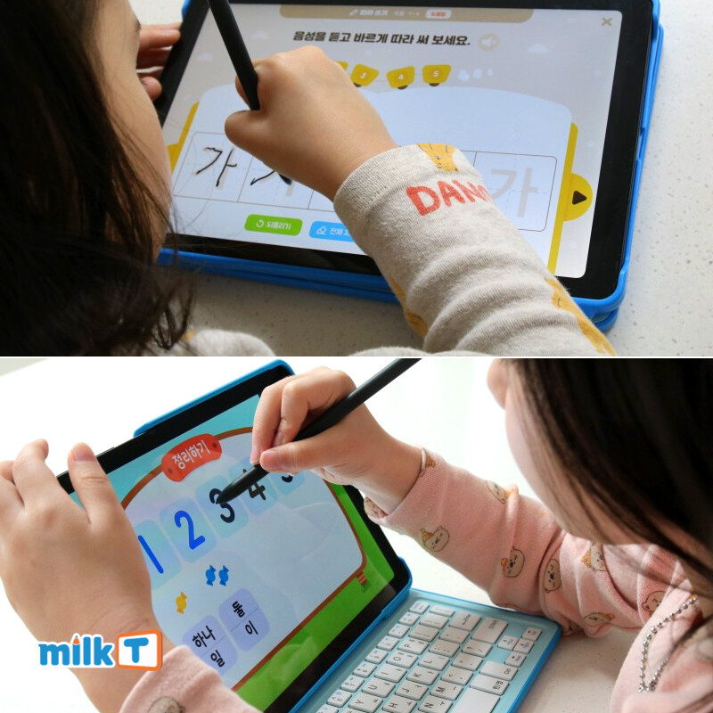 이에 천재교과서가 만든 태블릿 학습지 밀크티초등은 7세의 눈높이에 딱 맞는 콘텐츠를 엄선하여 제공하는 7세 전용 서비스 ‘밀크T키즈’를 운영한다. 초등학교 입학 전 알아야 할 국어, 수학, 영어 학습을 A부터 D코스까지 수준별로 제공하며 학부모에게 높은 만족도를 얻고 있다.