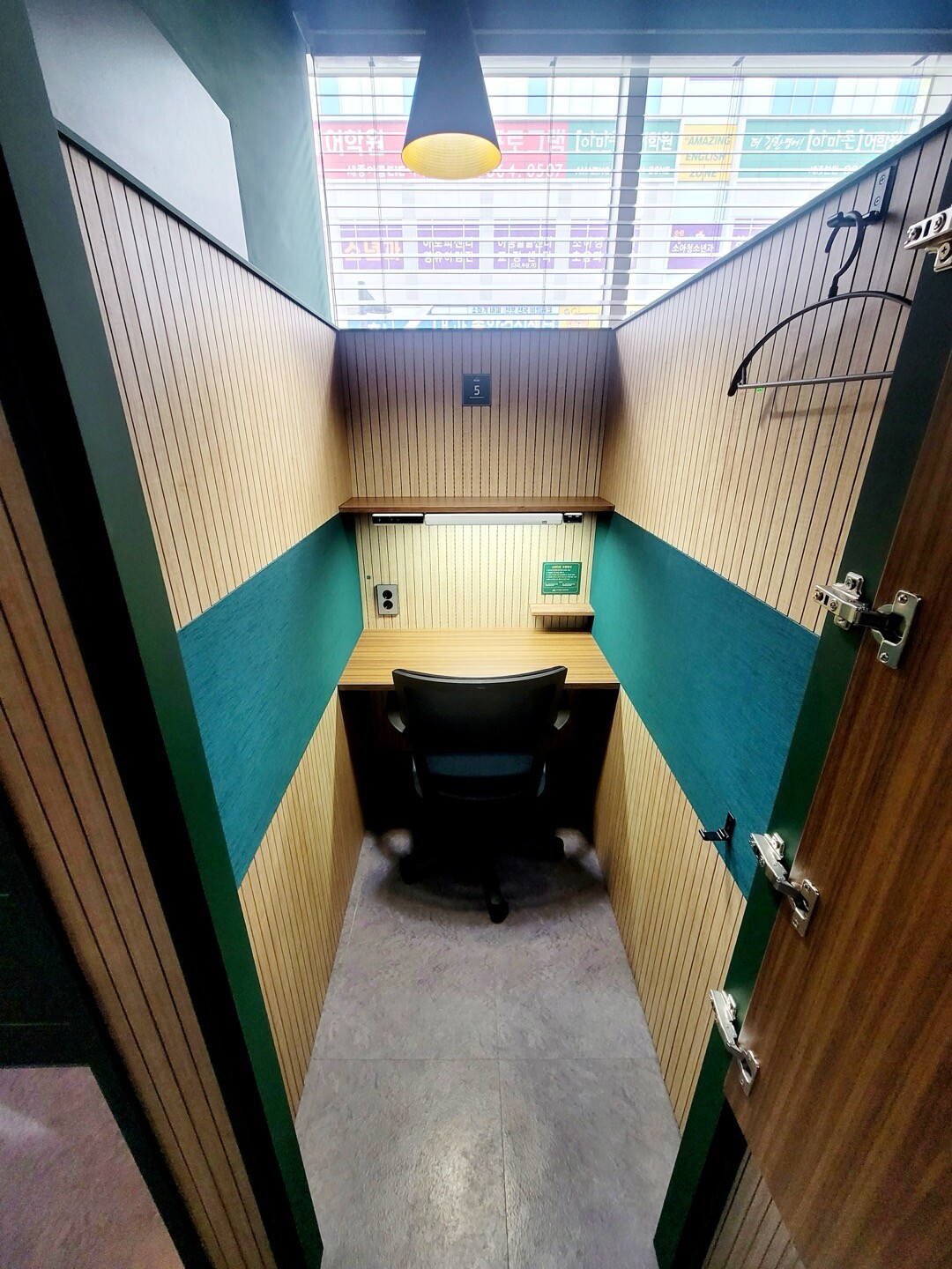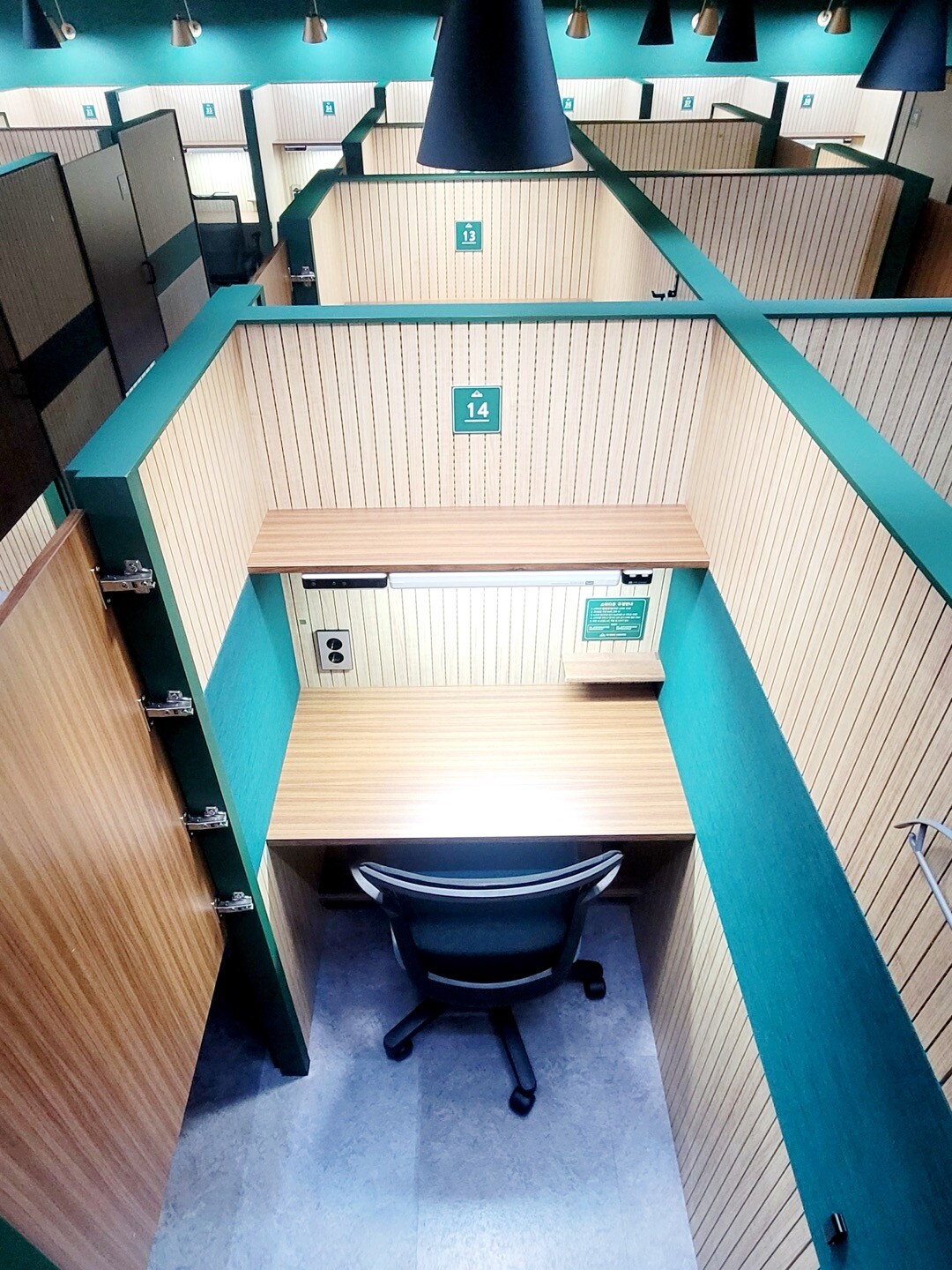 부스형 1인실 책상은 사방을 다 가려주는 구조로 공부하는 학생 개인의 프라이버시를 보호받을 수 있다. 다른 사람의 간섭이나 방해를 받지 않기 때문에 공부에 더욱 몰입할 수 있도록 한 것이 특징이다.