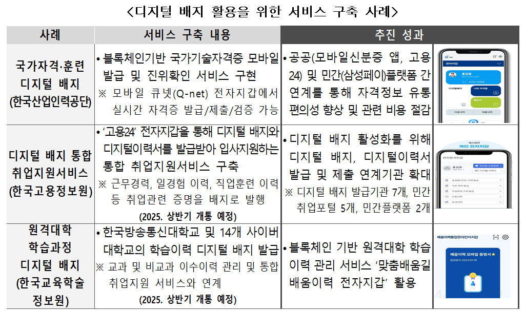 디지털 배지는 학습 경험과 성과를 디지털 형식으로 인증하는 도구로, 개인의 학습 이력을 디지털 지갑에 저장하고 SNS나 전자 포트폴리오에 연결해 활용할 수 있다. 이를 통해 개인은 자신의 역량을 구체적으로 보여줄 수 있으며, 기업은 구직자의 학습 이력과 역량을 확인해 필요한 인재를 채용할 수 있다.