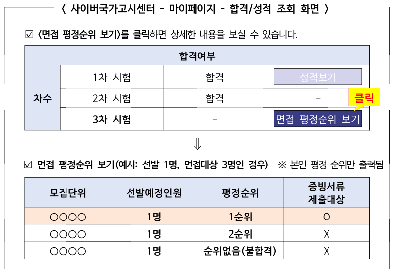 이번 공개는 11월 19일(수) 오전 9시부터 26일(수) 오후 6시까지 사이버국가고시센터(gosi.kr)에서 확인할 수 있으며, 응시자는 마이페이지의 ‘면접 평정순위 보기’를 통해 자신의 평정순위와 증빙제출 대상 여부를 확인할 수 있다.
