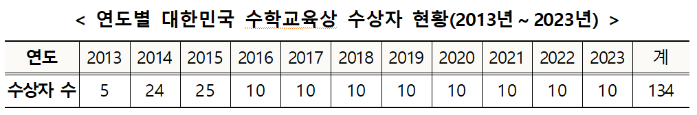 '대한민국 수학교육상'은 2013년부터 시행되어 수학교육 발전에 기여한 초등 교원 및 중등 수학 교원 10명을 포상하고, 우수 사례를 보급하기 위한 프로젝트로 진행되고 있다.