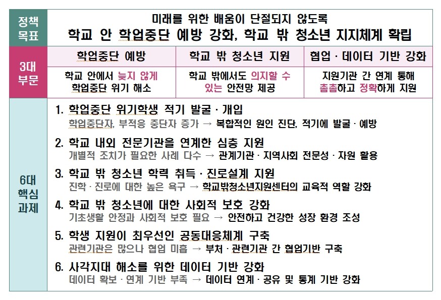 이번 방안은 ▲학업중단 예방 ▲학교 밖 청소년 지원 ▲협업·데이터 기반 강화의 3대 부문 6대 핵심과제로 구성된다.