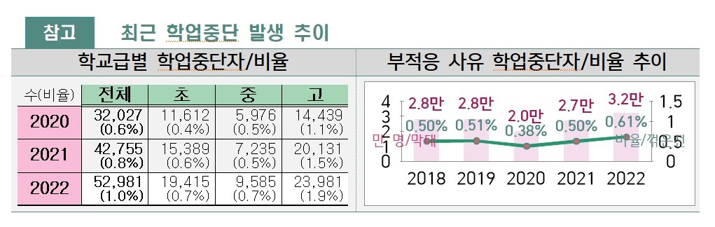 [피앤피뉴스=마성배 기자] 코로나 이후, 학업을 중단한 학생은 2020년에 32,027명이고, 2022년에는 약 2만 명이 증가한 52,981명인 것으로 밝혀졌다.