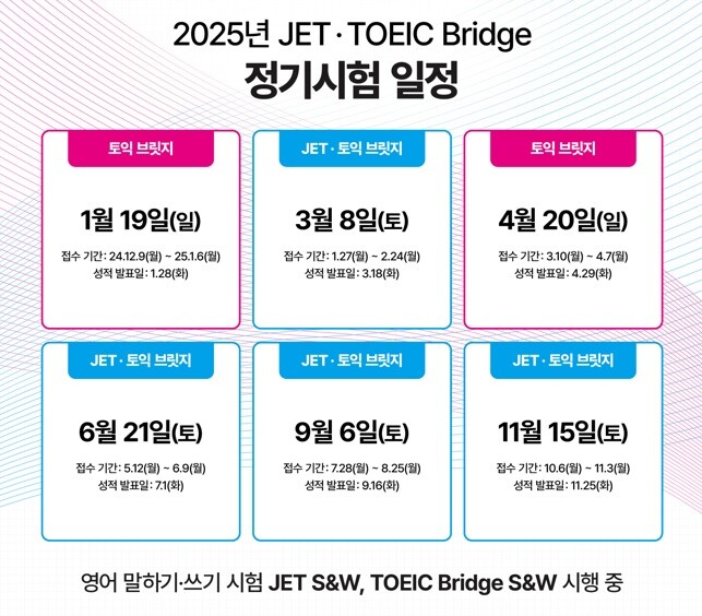 2025년 정기시험은 듣기·읽기와 말하기·쓰기 시험으로 나눠 운영되며, JET는 연 4회, TOEIC Bridge는 연 6회 실시된다.